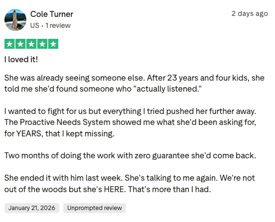 - Biggest Problems: Communication, understanding her needs, emotional connection